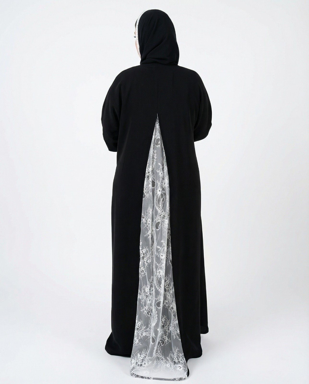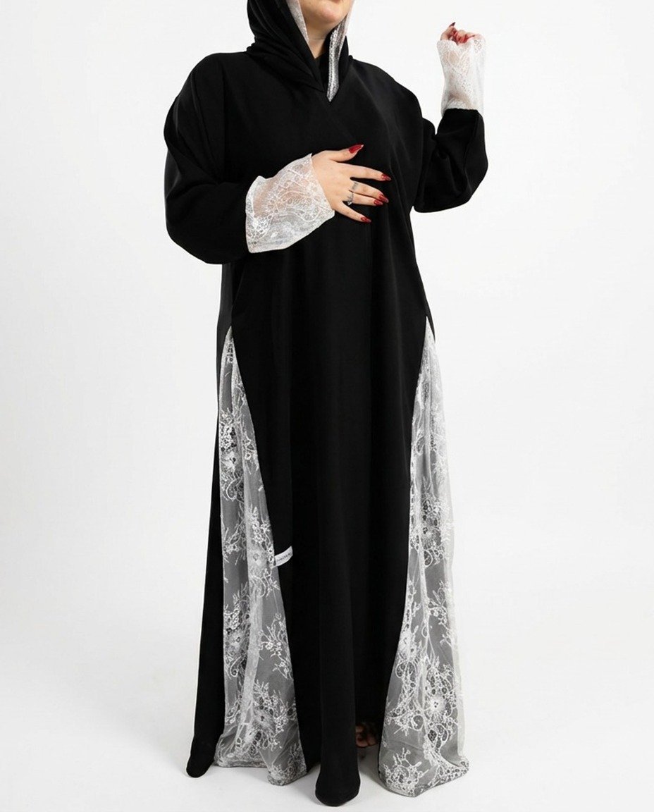 عباية سوداء بتصميم كلوش يمنحك إحساسًا بالفخامة والأناقة، مناسبة لمن تبحث عن عبايات دانتيل اسود، عباية دانتيل، عباية سودا، عباية مناسبات، عباية فخمة، وعبايات سعودية فخمة. مصنوعة من قماش دانتيل أبيض على الجانبين والخلف، مع أكمام مزخرفة بالدانتيل. تأتي بقصة كلوش واسعة تضيف لها لمسة جمالية وحركة جذابة أثناء الارتداء، لإطلالة متكاملة للمناسبات والإطلالات الراقية.
